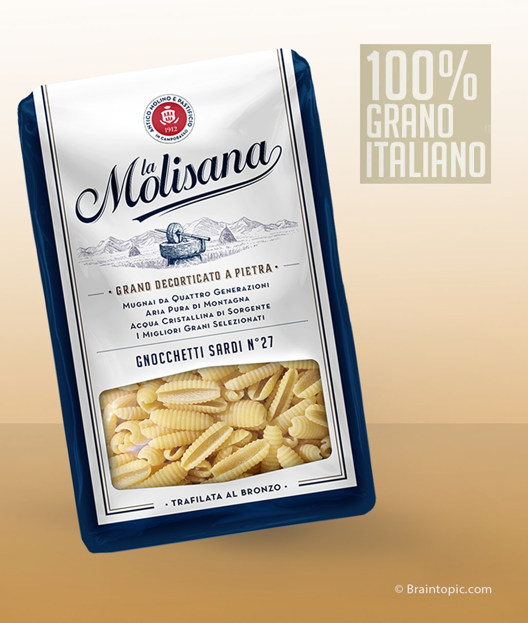 La Molisana vyrábí těstoviny vyrobené ze 100% tvrdé krupice z tvrdé pšenice pěstované v Itálii, oloupané od kamene a tažené bronzem.