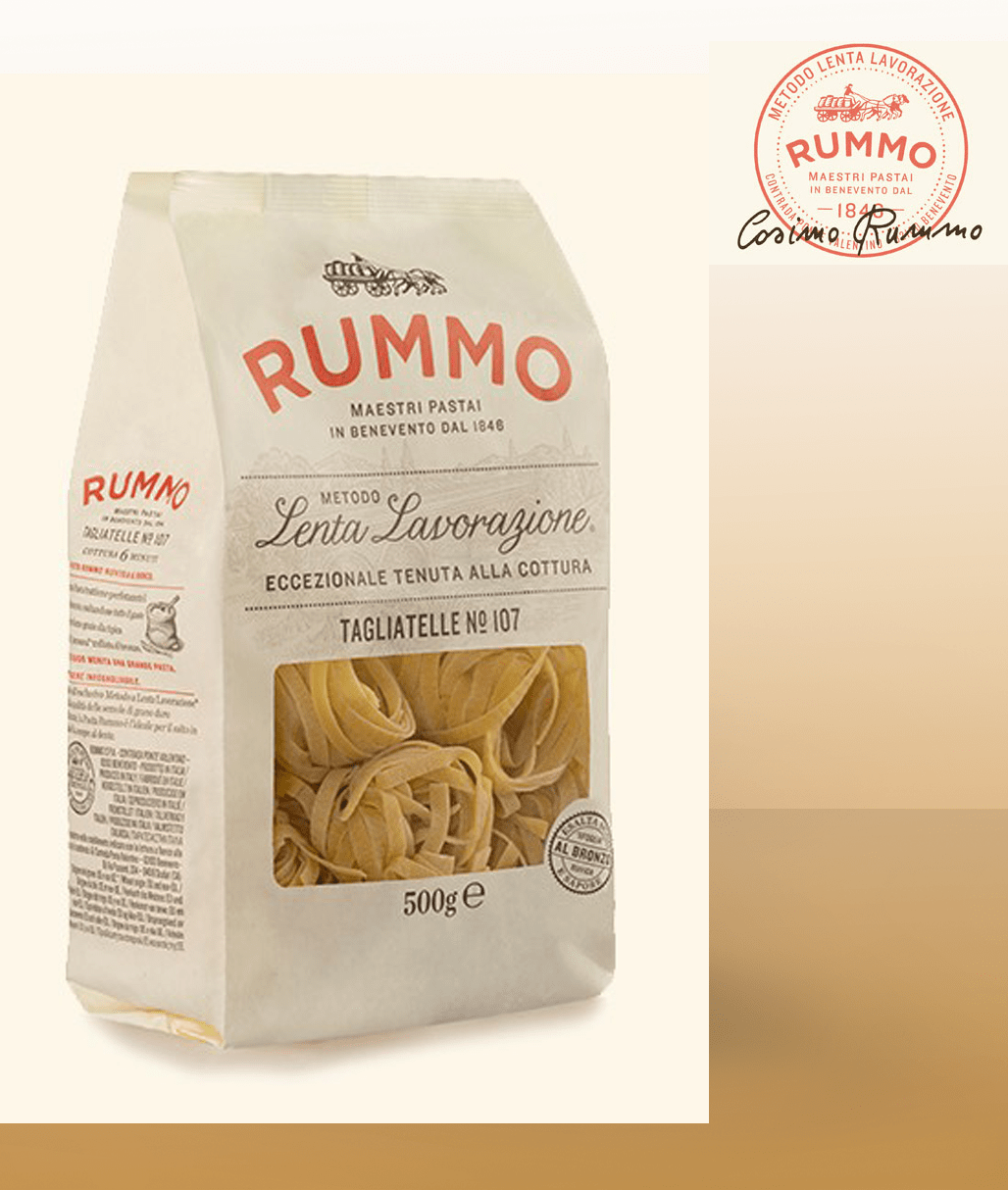 Hledání nejlepších surovin, fáze pomalého míchání, použití speciálních bronzových matric díky drsnosti, která dokáže zachovat jakýkoli druh omáčky, a mistrovské přirozené sušení pro zachování vůně pšenice činí z těstovin Rummo vysoce kvalitní produkt.