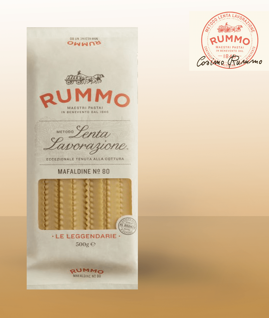 Hledání nejlepších surovin, fáze pomalého míchání, použití speciálních bronzových matric díky drsnosti, která dokáže zachovat jakýkoli druh omáčky, a mistrovské přirozené sušení pro zachování vůně pšenice činí z těstovin Rummo vysoce kvalitní produkt.