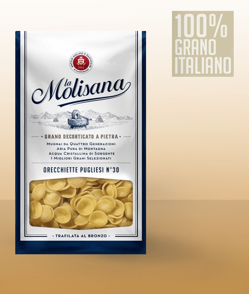 La Molisana vyrábí těstoviny vyrobené ze 100% tvrdé krupice z tvrdé pšenice pěstované v Itálii, oloupané od kamene a tažené bronzem.
