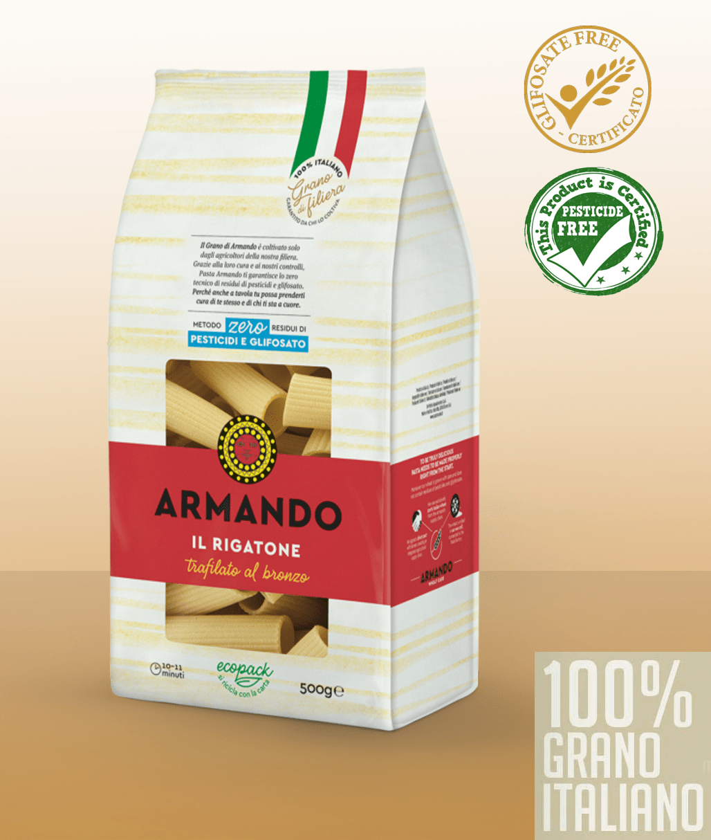 100% italská krupice z tvrdé pšenice a voda, tažená bronzem a pomalu sušená. Pšenice Armando se vyrábí pouze ze dvou přísad zpracovaných tradiční metodou. Zvláštní chuť vyniká mezi všemi ostatními těstovinami.